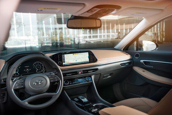Hyundai Sonata – переднеприводный седан бизнес-класса (хотя по «размерной иерархии» формально относится к сегменту «D»), который в самой южнокорейской компании именуют не иначе как «четырехдверным купе», сочетающий в себе экспрессивный дизайн, привлекательный и современный салон, достаточно производительную техническую составляющую и богатый уровень оснащения… Его основная целевая аудитория – неплохо обеспеченные мужчины средних лет и старше, которые хотят получить вместительный и безопасный семейный автомобиль за относительно небольшие деньги… Впервые «Соната» очередного, восьмого по счету, поколения была представлена широкой общественности в начале марта 2019 года на специальном мероприятии в Южной Корее, однако ее полномасштабный мировой дебют состоялся во второй половине следующего месяца на стендах международного Нью-Йоркского автосалона. По сравнению с предшественником автомобиль изменился по всем направлениям – примерил новый дизайн, «переехал» на другую платформу, укрупнился в размерах, получил совершенно новый интерьер и «вооружился» огромным количеством современных «прибамбасов». Экстерьер Внешность «восьмой» Hyundai Sonata выполнена в новом «фамильном» стиле южнокорейской марки под названием «чувственная спортивность» – выглядит седан достаточно привлекательно, сбалансированно и экспрессивно, а в его очертаниях сочетаются солидность с толикой спортивности. Спереди четырехдверка «щеголяет» эффектной оптикой с замаскированными под хромированный декор светящимися полосками, «заползающими» на капот, крупной «многогранной» решеткой радиатора и «фигурным» бампером. В профиль автомобиль и правда воспринимается как «четырехдверное купе» – он обладает приземистым и стремительным силуэтом с длинным капотом, небольшими свесами, выразительными бортами и покатой линией крыши, плавно перетекающей в коротенький «хвостик» багажника. Да и с тылу машине есть чем зацепить взгляд – чего только стоят необычные фонари, соединенные между собой светодиодной «перемычкой», которые соседствуют со скульптурным бампером. Размер и масса По своим габаритам Hyundai Sonata 2020 модельного года фактически выступает уже в E-классе (но формально еще числится в «D»): в длину она достигает 4900 мм, из которых на 2840 мм распространяется расстояние между колесными парами, в ширину насчитывает 1860 мм, а в высоту укладывается в 1445-1465 мм. В снаряженном состоянии четырехдверка весит от 1780 до 1905 кг в зависимости от модификации, причем по осям масса делится практически в равных долях. Интерьер Внутри «Соната» восьмого поколения встречает своих обитателей красивым, современным и весьма благородным дизайном, лишенным противоречивых решений, – стильный четырехспицевый мульти-руль с развитым рельефом в области правильного хвата, виртуальная комбинация приборов, «нарисованная» на 12.3-дюймовом дисплее, презентабельная центральная консоль с 10.25-дюймовым тачскрином медиацентра, узкими дефлекторами вентиляции и лаконичным блоком климатической установки. Но стоит отметить, что в начальных исполнениях все значительно проще – «инструментарий» имеет пару аналоговых шкал и вписанное между ними табло борткомпьютера, а торпедо украшают простенькая магнитола да крутилки кондиционера. Салон южнокорейского седана способен без особых проблем вместить в