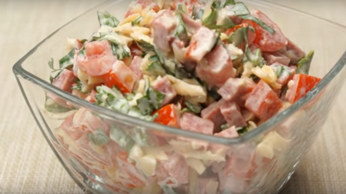 Салат получился вкусным, сытным и по летнему свежим за счет помидоров. Готовится он очень легко и смотрится на столе невероятно аппетитно.Салат можно готовить на каждый день или подать к праздничному столу. Необходимые продукты Начинаем приготовление Попробуйте также простой салат из баклажанов. Рецепт смотрите по ссылке. Приятного аппетита!