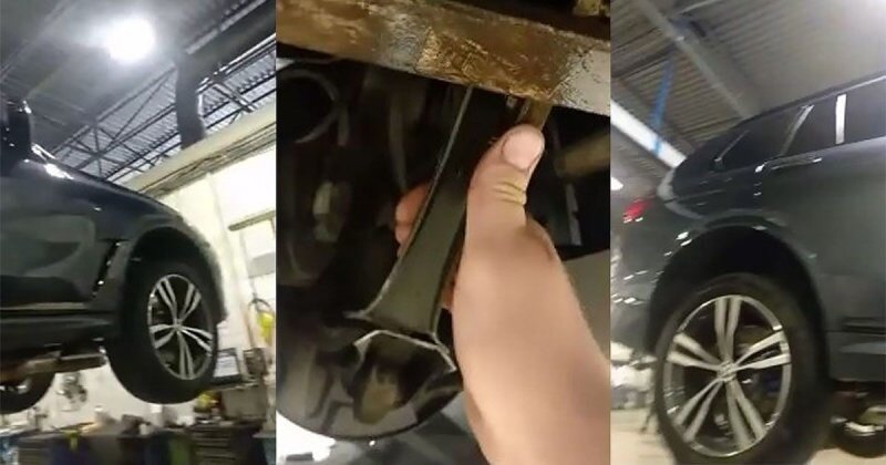 Владелец этого новенького флагманского кроссовера BMW X7 приехал на станцию техобслуживания с жалобой на неисправность подвески. С его слов, он всего лишь резко перестроился, но премиальный автомобиль такого испытания не выдержал.