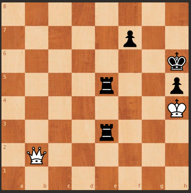 Предлагаю Вашему вниманию фрагмент партии Зикашинский - Протащик, 1990 год. У черных 2 ладьи и 2 пешки, против белого ферзя. Но ход белых, ничья.