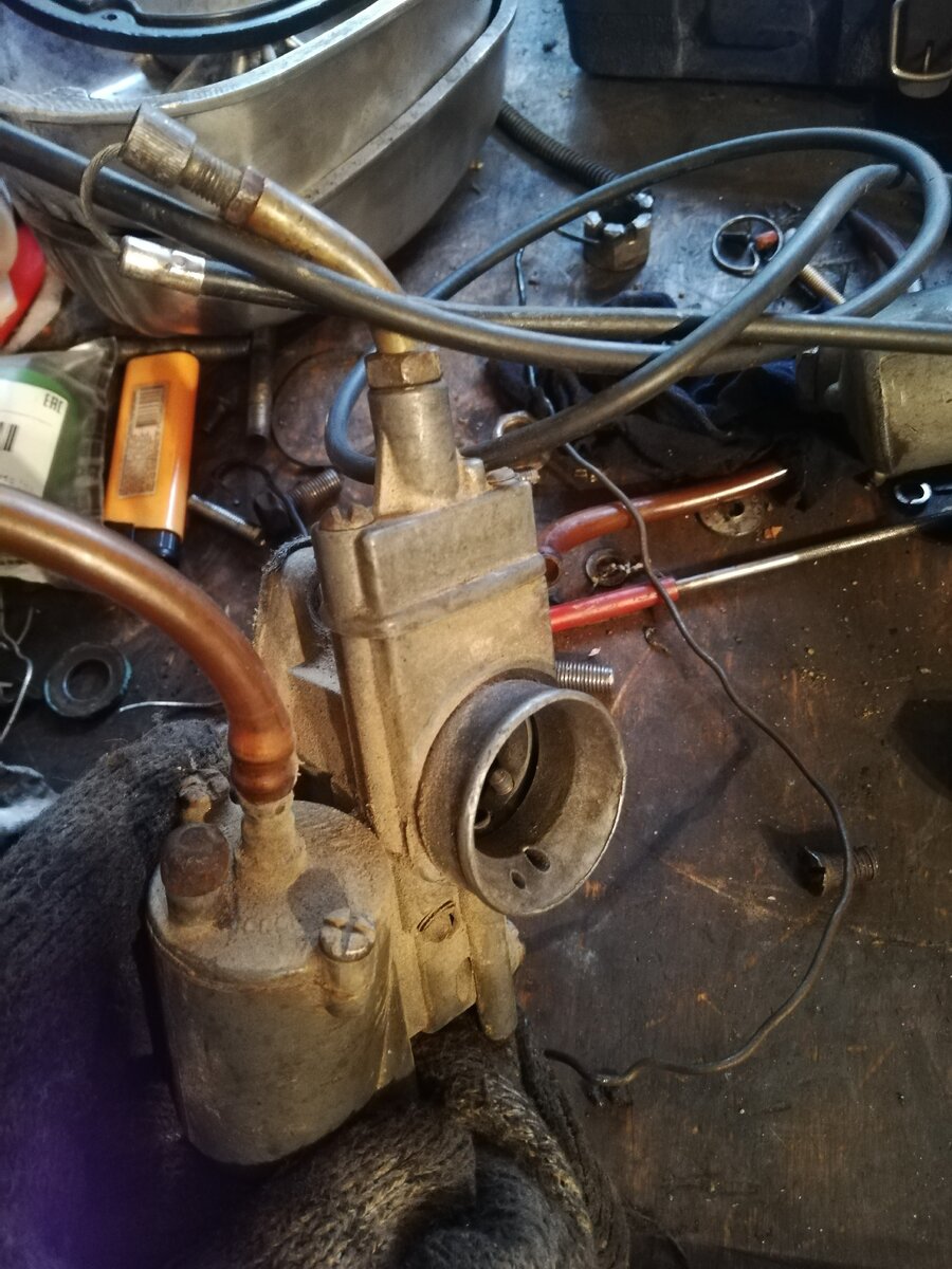 А вот при установке карбюраторов обратно на головки, выявилась неожиданная проблема: прилегающая плоскость карбюраторов оказалась деформирована "домиком", вследствие чего, в месте прилегания карбюратора к головке, невооружённым взглядом видна щель. Теперь понятно почему были такие толстые прокладки на карбюраторах (толщина не меньше 4 мм). Новые прокладки обычной толщины не могли закрыть такой зазор.