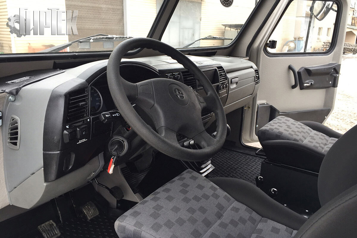 В салон ТРЭКОЛ-39294 вмещается 8 человек. В базовой версии стоит бензиновый мотор ЗМЗ-4062.10 мощностью 130 л.с. и объемом 2.3 л.