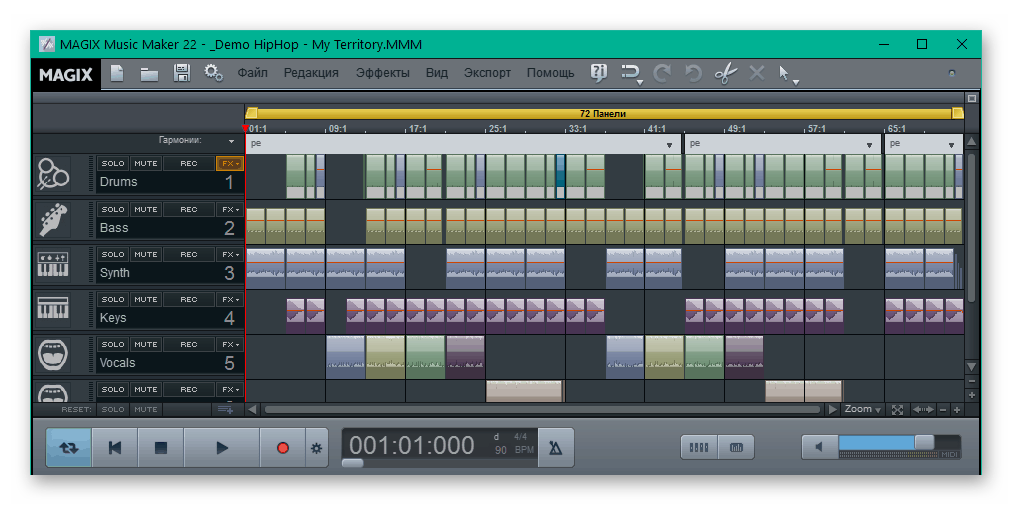 Отличный вариант для новичков, так как имеет восемь встроенных эффектов, нормализатор звучания и более семидесяти образцов мелодий, которые можно переделать по вкусу. Управление оснащено подсказками и инструкциями, интерфейс можно понять интуитивно. Программа имеет широкополосный эквалайзер, редактор нот и микшер с широкими возможностями. Оригинальности добавят инструменты – фортепиано, гитара, орган, трубы.