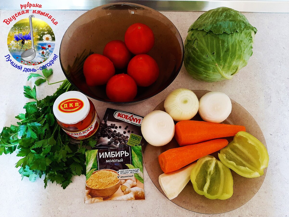- зажарка: 2 морковки, 3 луковицы, половину среднего корня пастернака, один болгарский перец, 4 ложки растительного масла, 5 помидор, стакан воды, 2 столовые ложки томатной пасты, соль и сахар, немного черного молотого перца;