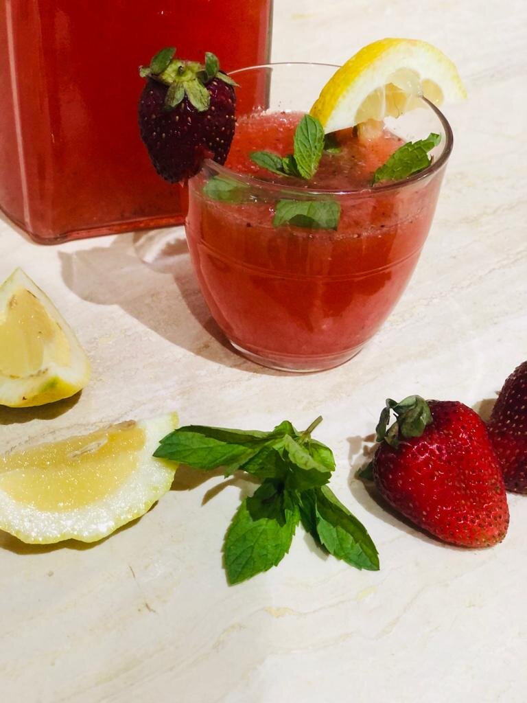 Очень вкусный лимонад, в меру кислый, в меру сладкий, и благодаря мяте так отдаёт свежестью. Даже моя привередливая свекровь выпрашивает стаканчик. Так же идеально подходит как угощение для гостей. Это моя палочка-выручалочка. Дочка выпрашивает постоянно всякие соки, а этот лимонад пьёт с удовольствием. Летом делаю клубничный, пока ягоды есть. А зимой добавляю ещё апельсины. В общем, делюсь с вами летним вариантом этого замечательного напитка. 5 минут и готово. Нам понадобятся: 3 средних лимона 400 гр клубники Несколько стебельков свежей мяты ( я брала около 5, но можно и больше) Стакан сахара ( 250 мл) 1.5-2 литра воды Готовка проще простого.. Но есть один важный момент: Наливаем около двух литров питьевой воды, можно немного тёплой и даём настояться этой массе примерно два часа. Если есть время, то можно убрать на ночь в холодильник.Затем через сито процеживаем лимонад, а жмых выкидываем. И наш напиток готов. Если вы хотите, чтоб лимонад был более прозрачным, то можно в сито