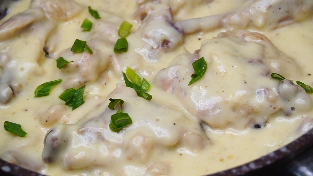 Теперь добавляем чеснок 4-5 зубчиков пропущенных через пресс, перемешиваем, пробуем на соль, если нужно добавляем и сразу снимаем с огня. Даем настояться курочки минут 10 и подаем к столу с любым гарниром. Если хотите, чтобы подлива была пожиже, тогда можно бульона оставить побольше.