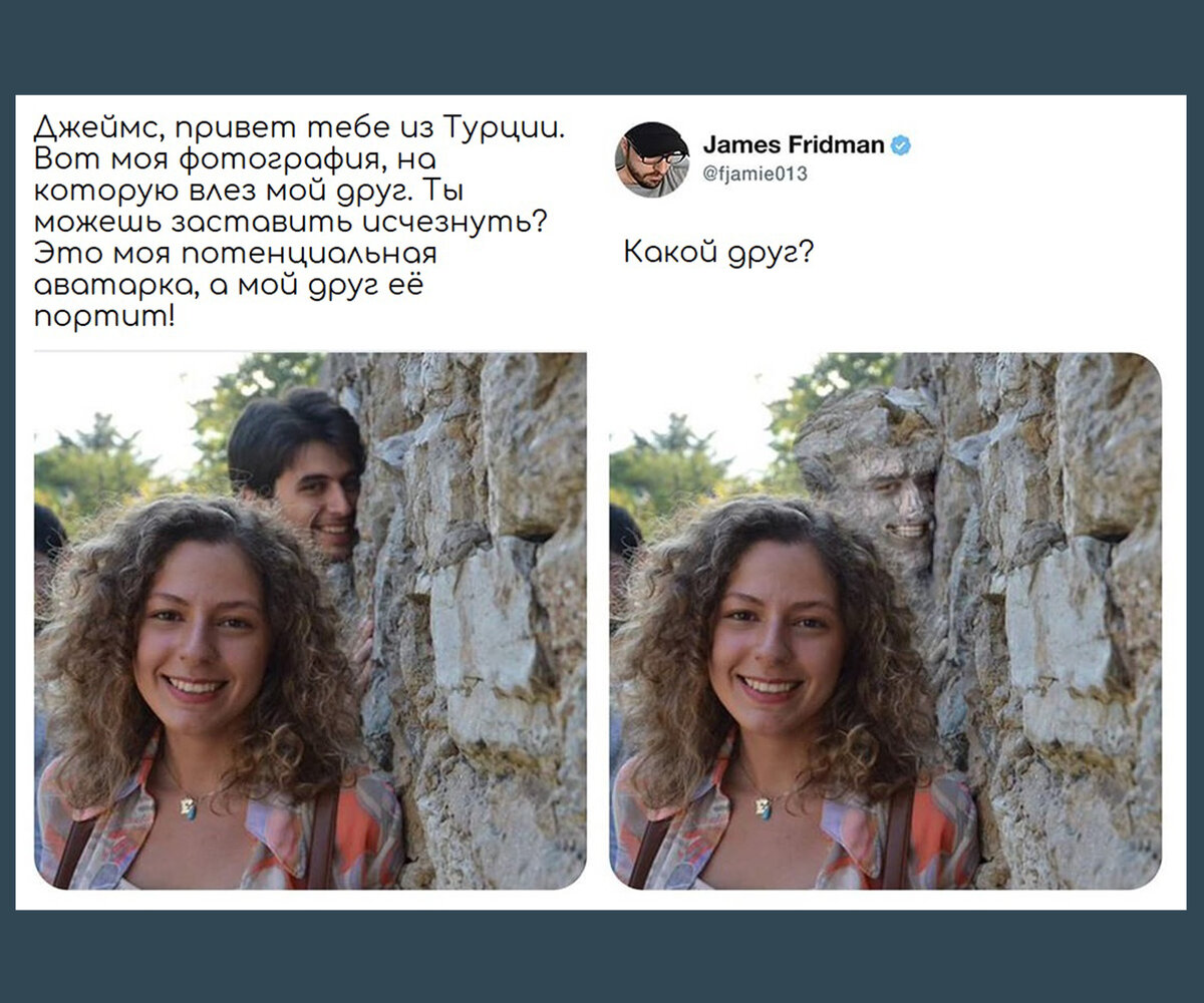 Давайте поговорим о фотографиях и о том, как наши друзья на них влияют. Ну, во-первых, друзья могут быть авторами этих фотографий, ведь момент, когда ты хочешь сфоткаться напротив какой-нибудь достопримечательности возникает куда чаще, чем вероятность того, что рядом с тобой окажется профессиональный фотограф. А во-вторых, друзья — это те люди, которые могут случайно испортить твою фотографию. Примеров куча. Вам поставили рожки, кто-то из компании прыгнул позже остальных, кто-то случайно моргнул, посмотрел не в ту сторону, мне продолжать?