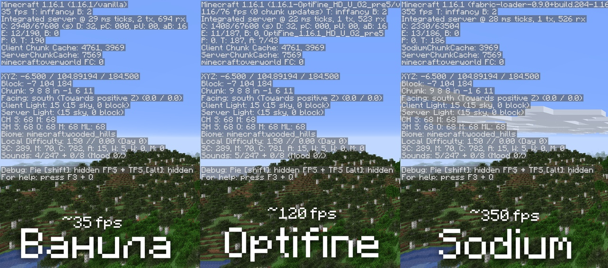 Помимо количества кадров, заметно возросла скорость загрузки чанков. Для полной прогрузки видимой зоны, Оптифайну потребовалось около 30 секунд, с модом Sodium - около 5 секунд.