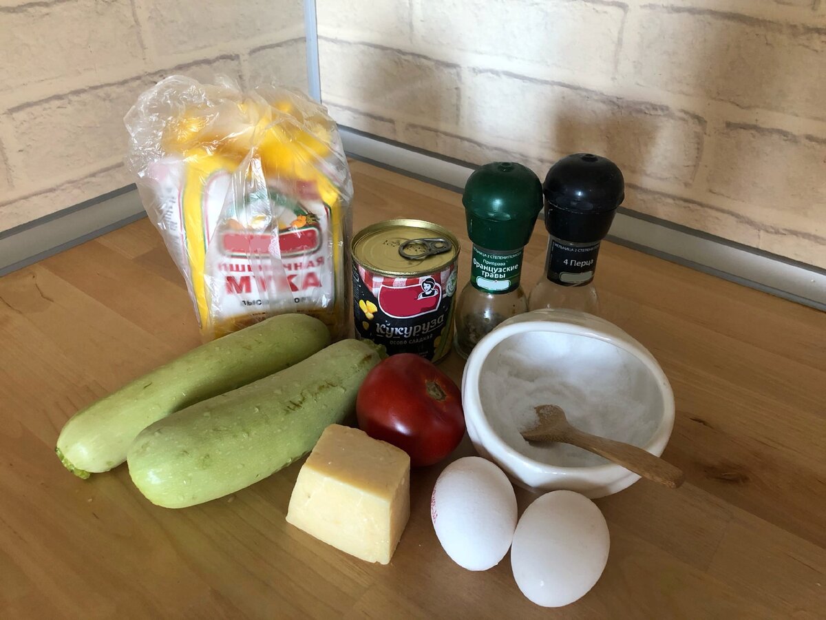Под помидорно-сырной корочкой Ингредиенты: Количество порций - 6; Время приготовления - 40 минут. Также мне понадобились: противень, фольга, миска, разделочная доска, нож, вилка. 1. Помыла и натёрла кабачки на крупной тёрке. Кабачки молодые, поэтому кожу с них не срезала. 2. Натерла сыр на средней тёрке. Половину отложила для будущей корочки. 3. Сложила в миску тёртые кабачки и сыр, добавила яйца и кукурузу. 4. Добавила муку, соль, смесь перцев и приправу. 5. Всё тщательно перемешала. Получилась однородная густая масса. 6. Порезала помидор кольцами. Поставила разогреваться духовку до 180°С. 7. Выложила овощную массу на противень, сверху разместила помидоры, посыпала тёртым сыром и поставила в предварительно разогретую до 180°С духовку на 30 минут. 8. Приятного аппетита!