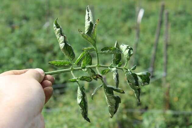 У огурцов это наиболее часто мучнистая роса, вызывающая пятнистость и пожелтение листвы, а также тля. У томатов – альтернариоз (обычно начинается в виде небольших пятен на нижних листьях), и даже, несмотря на жару, бывают и вспышки фитофтороза. На растениях, сильно ослабленных жарой, листва часто бывает подвядшей и с пожелтевшими краями, где и селятся грибные споры.