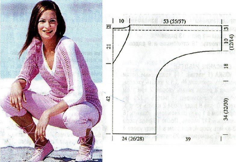 Берем данные для размеров 36/38, 40/42, 44/46. И для них пряжа цвета орхидеи - 350 (400/450) г, белого цвета - 50 (100/100) г. Работаем спицами длиной 60 см, круговыми спицами № 3 и № 4. Вяжем платочной вязкой, с плотностью 18 петель на 46 рядов в 10 см образца, и ажурным узором, с плотностью 18 петель на 36-37 рядов в 10 см образца. Описание ажурного узора, количество петель четное.