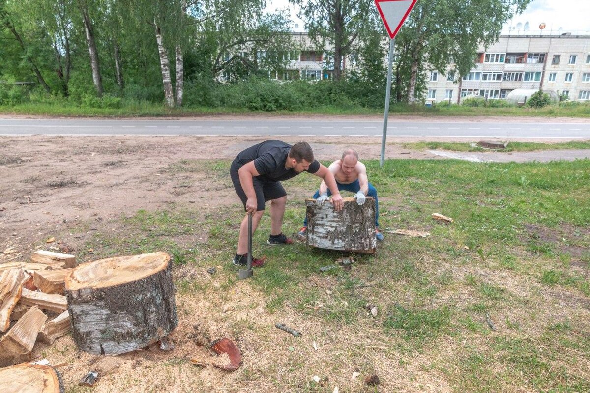 Ну что я могу сказать, теперь мне известно, зачем серьёзные дяди, на трень-площадках лупят кувалдой покрышку от трактора! Дело такое, через дорогу упала огромная берёза, неизвестного возраста. Уронил её ветер, но благо никто не пострадал. Дорога оживлённая. И кстати, дорога не поломалась)) Ветки от ствола "отлепили", а ствол на чурки поделили.