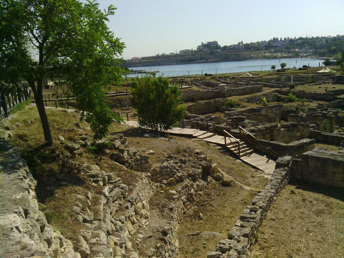 Херсонес - город, основанный греческими колонистами в 5 в. до н.э. на небольшом полуострове между Карантинной и Песочной бухтами и просуществовавший века до 14-го. Кстати, его название так и переводится: "Полуостров". Видно, с трудом добравшиеся до новой родины греки не имели сил заморачиваться с названиями.