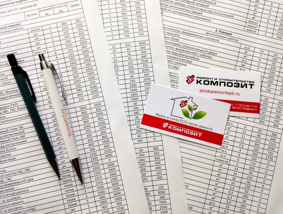 Смета на ремонт квартиры требуется чтобы сразу определить объем и стоимость работ. Ей важно уделить внимание, чтобы в будущем сэкономить свои нервы и деньги. В смете отражается порядок работ и стоимость за каждый этап. Стоит избегать составления типовой сметы, потому что в ней не учитываются особенности ремонта на вашем объекте. Что входит в смету на ремонт квартиры: Строительная компания Композит составляет полноценную, прозрачную и фиксированную смету. Стоимость за ремонт, указанная в смете, остается неизменной до окончания работ. Все изменения, которые вносятся в ходе работ фиксируются дополнительным соглашением. Расчет стоимости ремонта и составление стандартной сметы на ремонт-бесплатно! Читайте подробнее, что включает смета на ремонт квартиры от строительной компании Композит