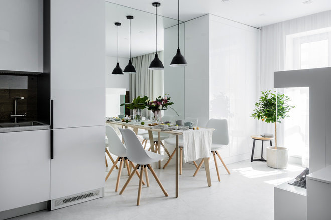 Моя знакомая недавно купила квартиру-студию размером 39 кв.м. в новом доме и конечно встал вопрос, как организовать спальное место. Изначально у этой квартиры неудобная вытянутая планировка, где всё на виду. Причем квартира просматривается насквозь буквально от входной двери. И любые стены или перегородки перекрывали бы свет с единственного окна. Много она пересмотрела разной информации, консультировалась с дизайнерами. Хорошо, что конструктив дома позволил изменить планировку, выделив скрытую от двери спальню и небольшую гостиную. Кровать спрятали за мебельной перегородкой, в которую встроен камин. Квартира получилась светлой и воздушной. Вся корпусная мебель