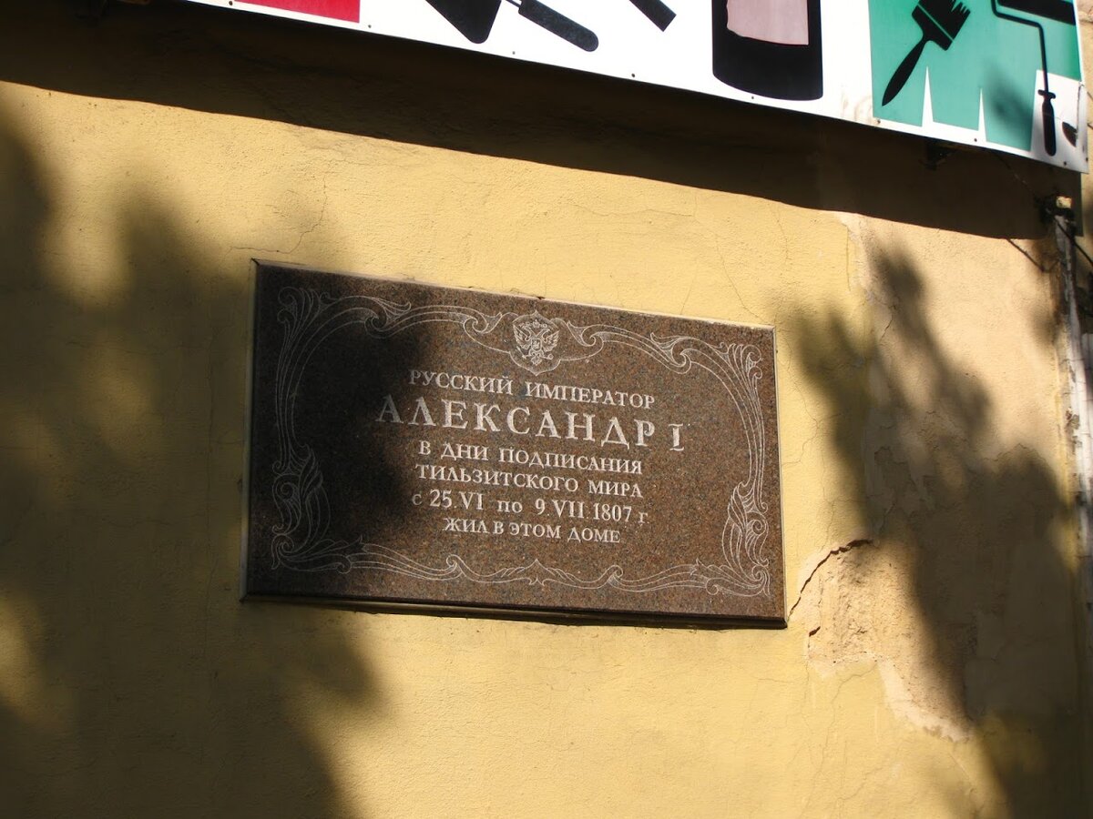 Город известен в истории в первую очередь, как место, где был подписан Тильзитский мир. Договор, подписанный Александром I и Наполеоном в 1807 году. Практически аналог пакта Молотова-Риббентропа, как видим, он точно также аукнулся для России. Конечно же, тут есть здание, куда приезжал император для его подписания.