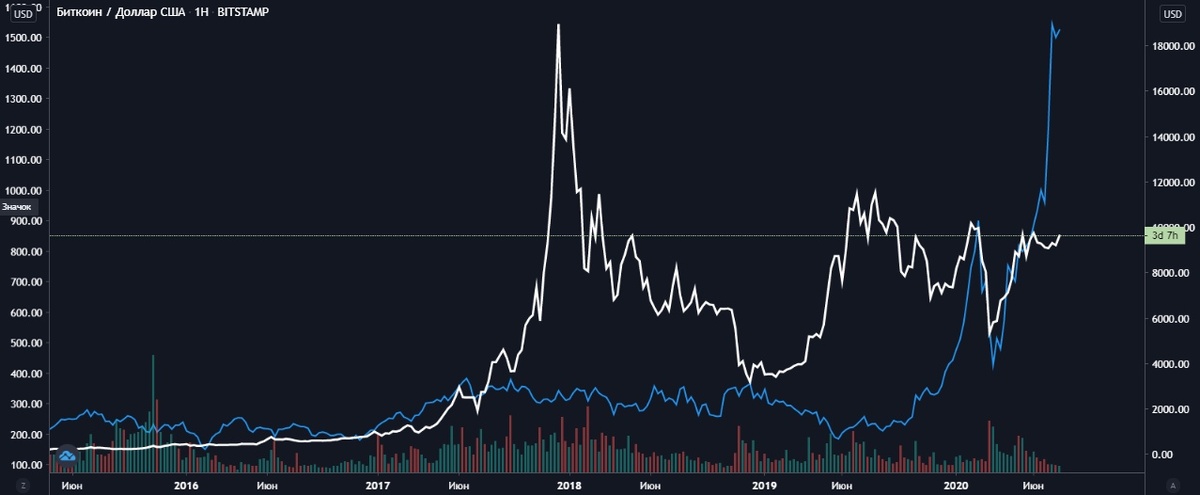 🚗 Много раз видел в сетях сравнение Теслы с биткоином. Такие идеи лучше проверять на графиках. Как видите, динамика акций TSLA с апреля 2020 (синяя кривая) почти в точности повторяет график битка в конце 2017 года, на самом пике хайпа. Любая хорошая новость и тогда, и сейчас вызывает ценовой скачок, часто без всякого фундаментального основания.