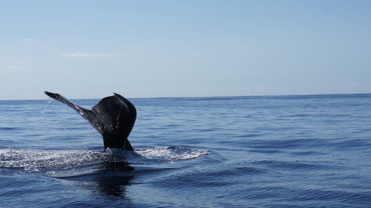 Параллельно с нами проплыл ещё один катер, побольше. Кит вынырнул и возле наших соседей. Многотонное тело бесшумно вошло в голубую твердь, и только с хвоста шумно скатилась вода. Водная феерия продолжалась около часа или двух. Время не ощущалось. Устав фотографировать, все просто смотрели на игры великанов.