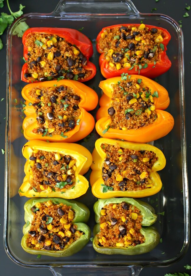 - Разогреть духовку до 250 градусов. В форму для запекания положите половинки перца и щедро наполните их начинкой из киноа. Слегка надавите, чтобы уплотнить и заполнить все щели. Накрыть фольгой и выпекать 35-40 минут. Снимите фольгу и выпекайте еще 10 минут. Подавайте с любыми желаемыми начинками.