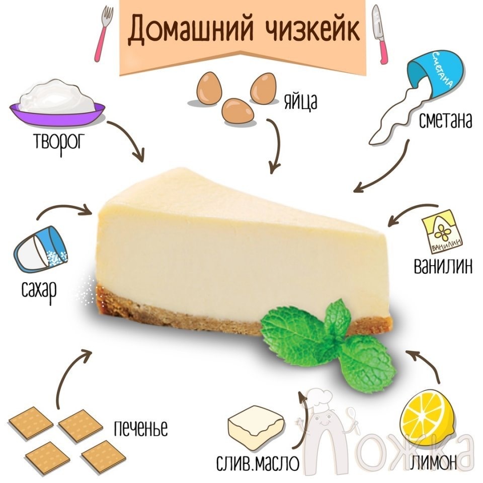Берем 👇🏻 250 гр печенья (типа "Юбилейного") 100 гр сливочного масла 3 шт яиц 100 гр сахара 1 пакетик ванилина 600 гр творога 100 гр сметаны Цедра одного лимона Что делаем 👇🏻 Печеньки перемалываем в блендере и смешиваем с растопленным сливочным маслом, а затем выкладываем в форму и делаем бортики. Это все убираем в холодильник отдыхать. Иички взбиваем с сахаром и ванилином до белого цвета. Творог перебиваем в блендере и добавляем к нему сметану и цедру лимончика, перемешиваем. Затем вливаем яичную смесь и снова взбиваем все вместе. Выливаем начинку на нашу основу и выпекаем в разогретой до 180 градусов духовке около полчаса. Остужаем и ставим в холодильник отдохнуть, лучше всего на ночь. Чизкейк получается точно такой как в ресторанах!
