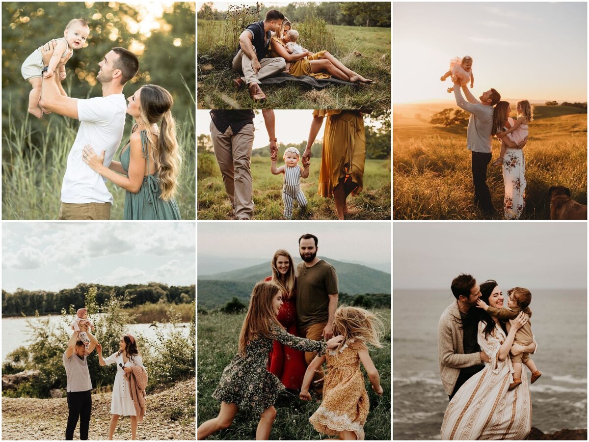 Если же вы фотографируетесь на природе, то лучше подойдут природные цвета (зелёный, коричневый, серый, синий). Подберите одежду так, чтобы хотя-бы одна вещь, у каждого из членов семьи, была одного цвета. Так вы будете прекрасно гармонировать между собой. Не нужно на природу одевать не удобные вещи, лучше всего одеть то, в чем вам будет удобнее двигаться, ведь фотограф может заставить вас даже прилечь на землю.