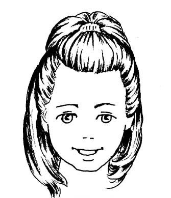 Отчешите волосы назад, горизонтальным пробором выделите волосы в верхней теменной зоне. Поднимите выделенные волосы вверх, на верхней точке головы завяжите хвостик. Украсьте его бантом, ленточкой или красивой завязкой.