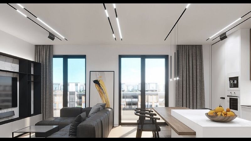 Отдельно необходимо сказать о кухонной зоне. Посредством подвесных светодиодных светильников в помещениях обеспечивается подсветка фасадов мебели. Как и в случае с детской комнатой, идеально подойдут однофазные треки. Светильники желательно подбирать с узкими углами рассеивания. Общее освещение кухни лучше формировать устройствами, мощность которых не будет превышать 20 Вт. Подобным образом можно оформлять и гостиные комнаты, обеспечивая частичный или полный минимализм. Идеально с трек светильниками будет смотреться лаконичная мебель в белых, черных или серых цветах с правильной геометрией.
