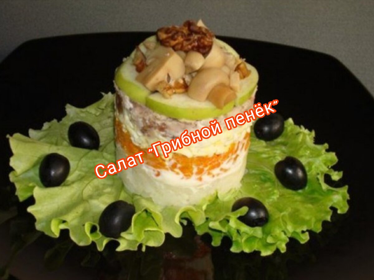 Ингредиенты Морковь 4 шт Картофель 3 шт Яблоко зеленое 3 шт Яйцо 4 шт Грибы 150 г Курица (филе) 300 г Орехи грецкие 10 г Майонез Соль Салат латук Маслины Морковь, яйца и картофель очистить и натереть на крупной тёрке. Подсолить овощи и яйца по вкусу. Куриное филе нарезать кубиками, подсолить. Яблоко нарезать дольками и опустить в подсоленую воду (это предохранит их от потемнения). Ядра орехов порубить ножом. На порционную тарелку выложить листья салата, установить кулинарное кольцо (за его неимением можно воспользоваться обрезанной консервной банкой или обрезанной литровой пластиковой бутылкой). Выложить салат слоями (их очередность можно нарушить): - морковь, - майонез, - яйца, - картофель, - майонез, - курица, - яблоко, - нарезанные грибы, - рубленные орехи. Снять кулинарное кольцо и украсить салат перед подачей, поместить салат в холодильник на пару часов. Приятного аппетита!