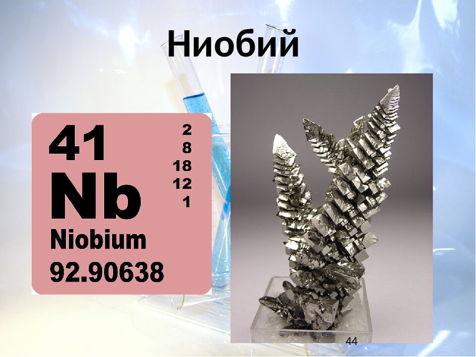 История. Ниобий был открыт в 1801 г. английским учёным Чарльзом Хэтчетом в минерале, присланном ещё в 1734 году в Британский музей из штата Массачусетс Джоном Уинтропом (внуком Джона Уинтропа младшего). Минерал был назван колумбитом, а химический элемент получил название «колумбий» (Cb) в честь страны, откуда был получен образец — Колумбии (в то время синоним США). В 1802 году А. Г. Экеберг открыл тантал, который совпадал практически по всем химическим свойствам с ниобием, и поэтому долгое время считалось, что это один и тот же элемент. Лишь в 1844 году немецкий химик Генрих Розе установил, что это отличный от тантала элемент и переименовал его в «ниобий» в честь дочери Тантала Ниобы, чем подчеркнул сходство между элементами. Однако в некоторых странах (США, Англии) долго сохранялось первоначальное название элемента — колумбий, и только в 1950 году решением Международного союза теоретической и прикладной химии (ИЮПАК, IUPAC) элементу окончательно было присвоено название ниобий. Впе