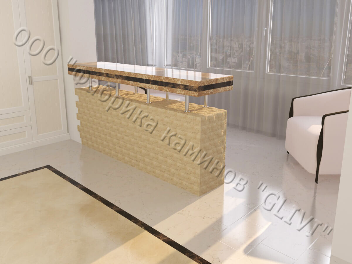 Материал, из которого может быть выполнена как сама барная стойка, так и окружающие ее полки, достаточно вариативен – от простого ДСП, до стекла или камня. Но согласитесь, если на Вашей кухне уже был использован натуральный камень, например, для изготовления кухонной столешницы или же мойки, то барная стойка из ДСП будет выглядеть несколько нелепо. Поэтому барная стойка из натурального камня – именно то, что нужно Вам в такой ситуации.