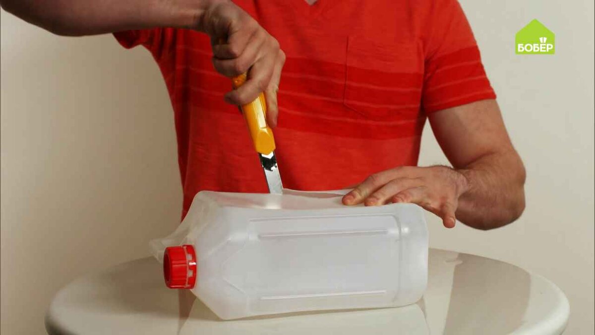 У пустой пластиковой канистры вырежьте боковую стенку.