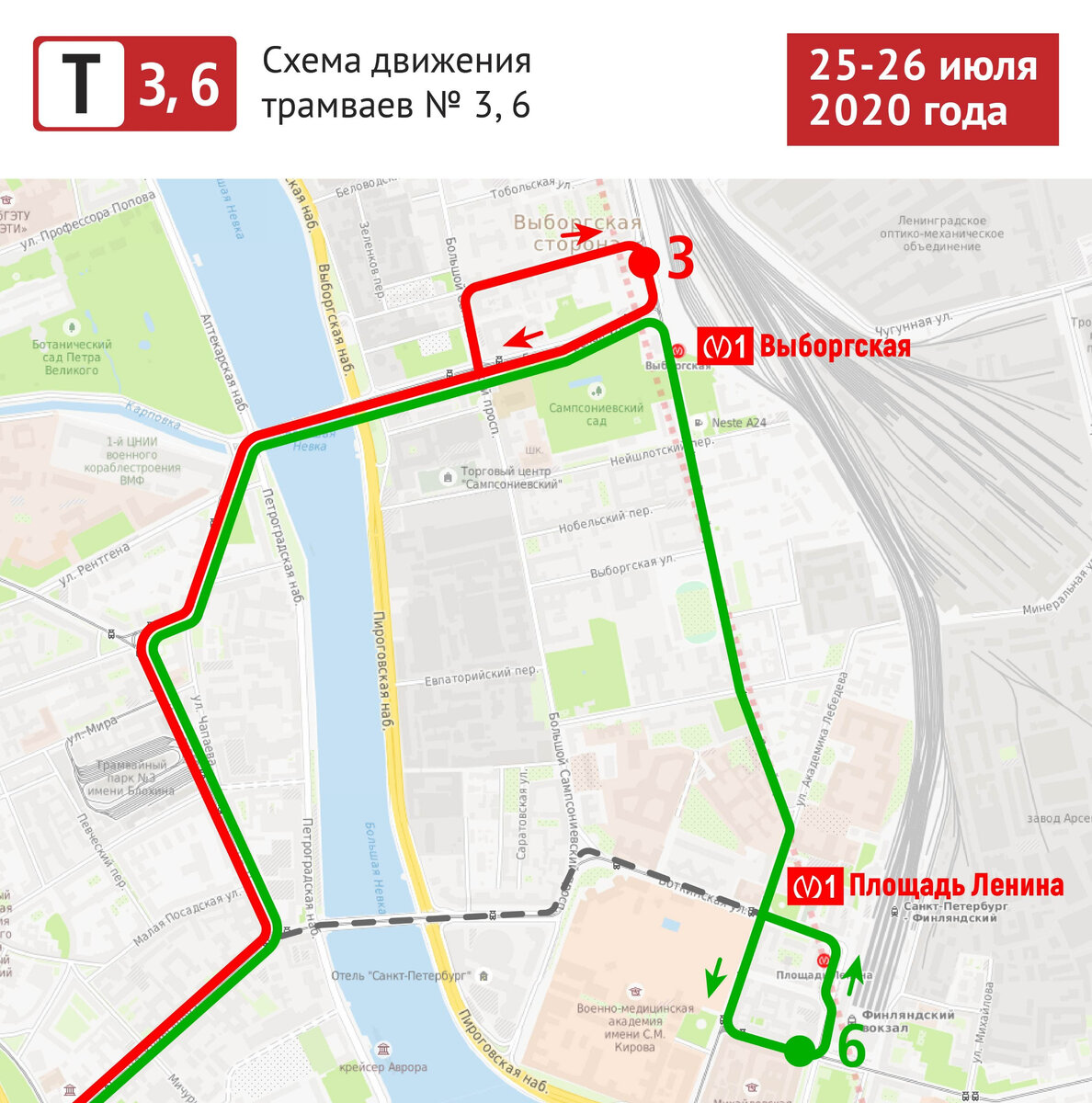 – трамвай № 3: от ул. Куйбышева в объезд по ул. Чапаева, Гренадерскому мосту, Гренадерской ул. до конечной остановки «Метро «Выборгская»;