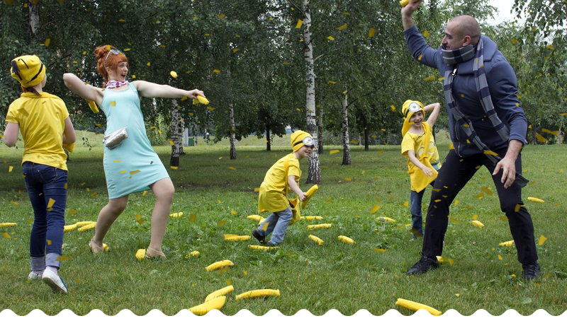 - Нужно добежать до стула, взять ложку миньона и, не уронив, донести его до команды.