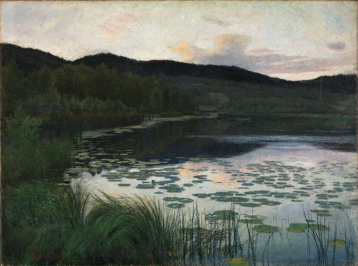 Хотелось бы мне сейчас оказаться в уголке природы, изображенном на сегодняшней картине. Спокойное озеро окружают тенистые лесные холмы. Смеркается, и солнце уже почти исчезло за линией горизонта. Слабый отблеск света виден на поверхности воды, наряду с отражениями облаков, холмов и перламутрового мерцания неба. Вдали, в тусклом свете, можно различить небольшую лодку с фигурой, направляющей ее в сторону горизонта. На переднем плане, ближе к зрителю - тонкие и зеленые камыши. Они так же неподвижны в спокойный вечер, как и нежные кувшинки, рассыпанные по озеру, подобно звездам в небе. Картина изображает магические сумерки столь характерные для скандинавских лесов в летнюю ночь. Безмятежная атмосфера картины навевает мысли о безвременье и постоянстве, которые управляют загадочными и вечными законами природы. Ощущение природного мистицизма усиливается за счет темноты, сгущающейся вокруг озера и за счет отражений на поверхности воды, словно бы переплетающих небесное и земное. Китти Хьелл