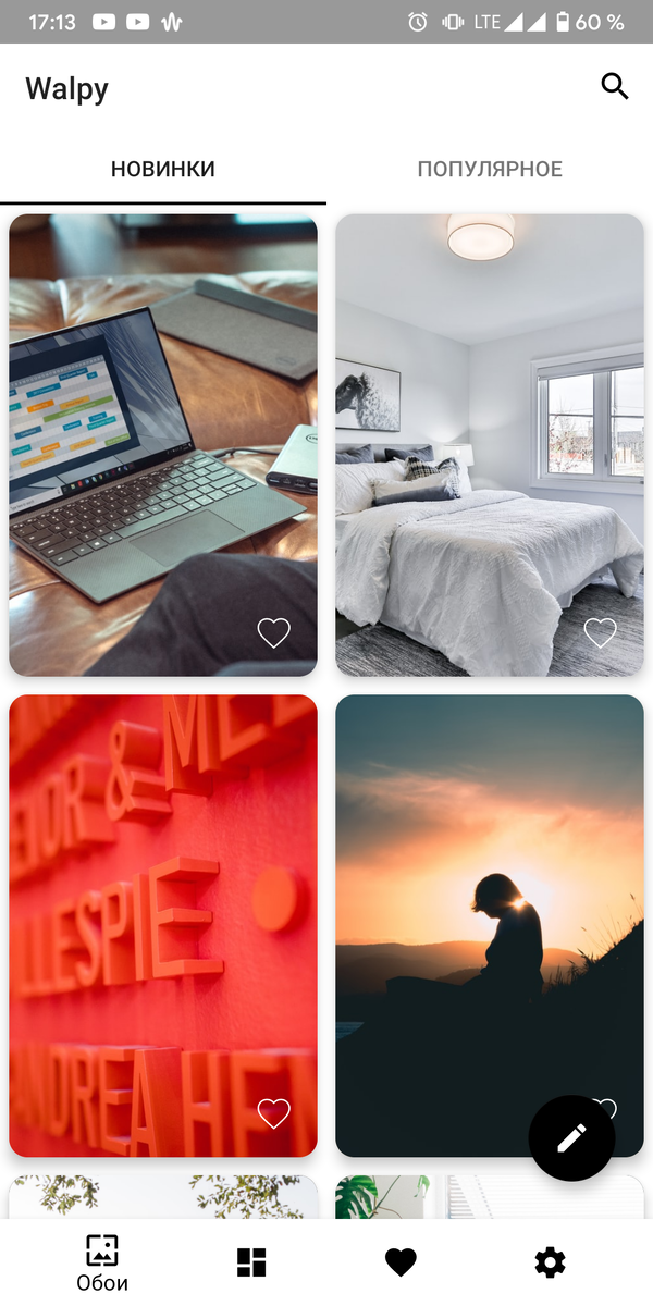 Привет, Мир! Как часто Ты меняешь обои рабочего стола своего Android? Я вот, например, практически каждый день. И для этого я использую всего одно приложение - Walpy. Дизайн Приложение сразу встречает нас бесконечным списком обоев на разные тематики, по этому подобрать подходящую обоину на своё устройство не создаст труда, к тому же база обоев обновляется каждый день. Имеется так же выбор картинок по категориям, которых тоже огромное количество, начиная от "Природы" и заканчивая картинками на тему "Вегетарианства" и заканчивая различными текстурами. Функционал При открытии какой либо картинки само собой имеется возможность установки ее либо на рабочий стол, либо на экран блокировки, либо и на рабочий стол и на экран блокировки одновременно. Помимо этого имеется небольшая настройка картинок. Можно добавить блюр, изменить яркость либо добавить виньетки, все на твой вкус. Заключение Walpy является тем приложением, которым лично я пользуюсь каждый день. Мне нравится изменять внешний ви