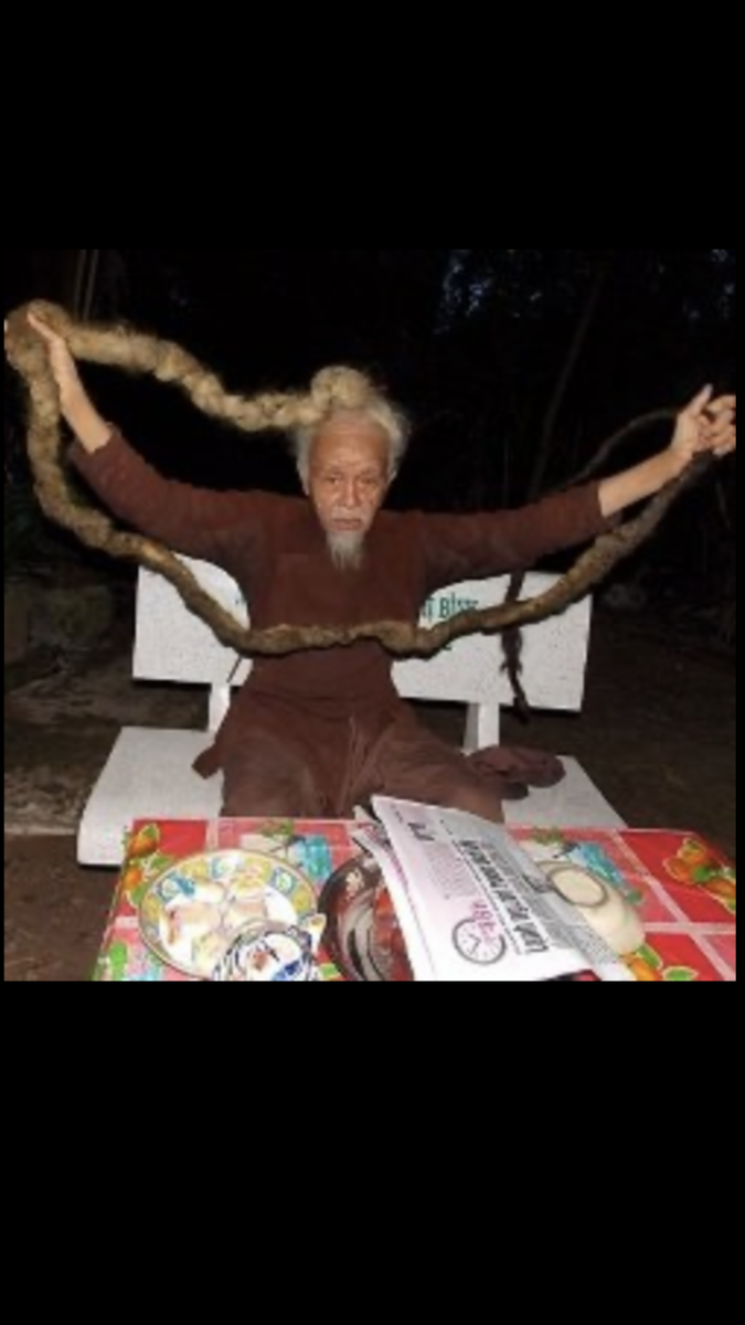 85-летний вьетнамец Нгуен Ван Цзянь, не стриг волосы с тех пор, как был в 12 классе школы. За 70 лет его волосы выросли на 4 метра в длину и весят 2 килограмма. Будучи еще мальчиком, Нгуен предпочитал носить длинные волосы. Он завязывал их в пучок, чтобы они не мешали его повседневным делам. В 12 классе учитель посоветовал ему состричь волосы, но после того, как мальчик последовал его совету, он начал испытывать странную боль. До стрижки у него никогда не было никаких проблем со здоровьем, и он даже не знал, что такое грипп. Все это привело его к мысли о том, что он больше никогда не даст никому состричь его волосы и он решил их отращивать. С тех пор прошло 70 лет и его "драконий хвост", как он сам называет свою прическу, достиг длины 4-х метров. Хотя вьетнамец поклялся никогда больше не стричься, волосы все же доставляли ему некоторое неудобство. По мере того, как рос "хвост", мытье волос превращалось в долгую и мучительную процедуру. Волосы приходилось так долго сушить, что у несчаст