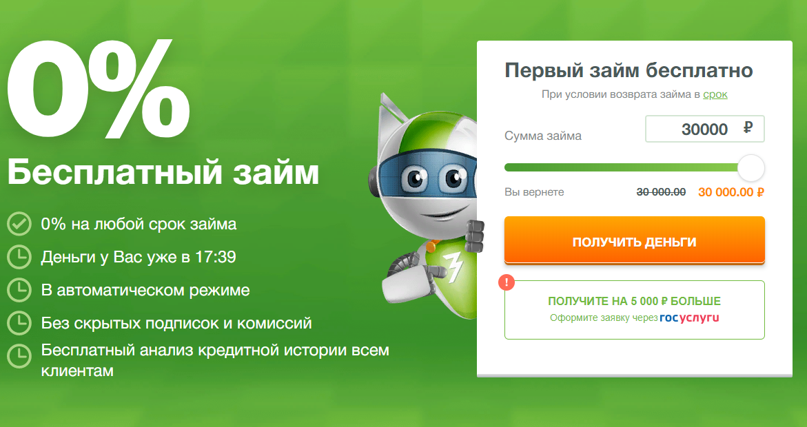 Бесплатный займ 0% на любой срок займа Деньги у Вас уже В автоматическом режиме Без скрытых подписок и комиссий Бесплатный анализ кредитной истории всем клиентам Кто может получить первый онлайн займ Требования к потенциальному заемщику: Каждый соответствующий этим требованиям человек может быстро занять с помощью сервиса Займер Робот Онлайн Займов до 30000 рублей. Займ онлайн можно оформить в любой точке земного шара. Если Вы работаете без трудовой книжки, дома, или имеете источники дохода помимо зарплаты (пенсию или стипендию), нас это не смущает. Среди наших заемщиков есть студенты ВУЗов, молодые мамы-декретницы, пенсионеры. Огромный процент сотрудников получает зарплату "в конверте", такой доход мы тоже рассматриваем. Получить займ