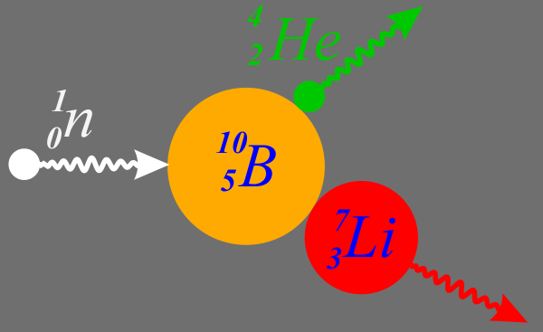 При облучении нейтронами опухоли, избирательно накопившей радиоактивный бор B(5,10), образуется Li(3,7) и некоторое излучение, воздействующее на опухоль. Что это за излучение? // Ремизов А.Н., Максина А.Г. "Сборник задач по медицинской и биологической физике", 2001 г. https://bookmix.ru/bookprice.phtml?id=84492 Рисунок. Схема реакции, при которой облучаемый нейтронами бор-10 превращается в литий-7 и альфа-частицу.