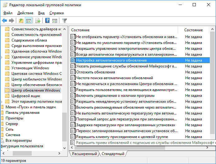 2. Перейдите к разделу «Конфигурация компьютера» — «Административные шаблоны» — «Компоненты Windows» — «Центр обновления Windows». Найдите пункт «Настройка автоматического обновления» и дважды кликните по нему. 3. В окне настройки установите «Отключено» для того, чтобы Windows 10 никогда не проверяла и не устанавливала обновления. Закройте редактор, после чего зайдите в параметры системы и выполните проверку наличия обновлений (это нужно, чтобы изменения вступили в силу. Сообщают, что иногда срабатывает не сразу. При этом при ручной проверке обновления найдутся, но в будущем автоматически поиск и