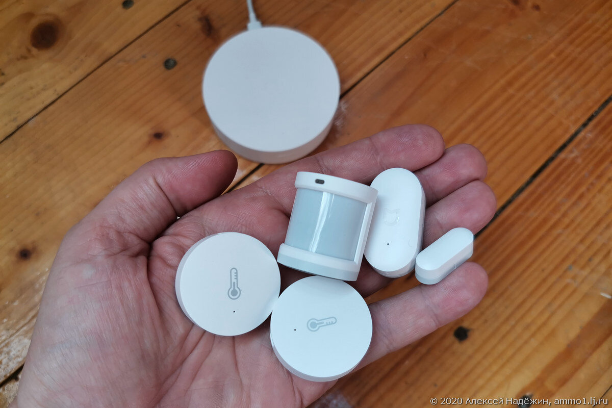Каждый, впервые увидев датчики умного дома Xiaomi, удивляется их миниатюрному размеру. У меня в руке два датчика температуры и влажности, датчик движения и датчик открывания двери или окна.