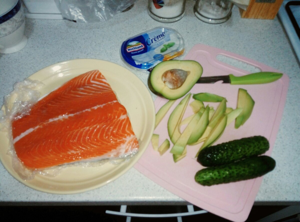 Последнее время я стала готовить рыбу все чаще. Особенно люблю красную, хоть и понимаю, что она очень дорогая, а пользы от нее не особо много, ввиду того, что ее выращивают на ферме, а не ловят в холодных водах Атлантики. Но все-таки иногда для настроения я ем роллы с лососью или стейки семги на грилле. Вот сегодня я решила просто сделать малосольную рыбку, после чего наварганила рулетиков. Может, я сейчас не открою Америку. Все про эти рулетики с лавашем, наверное, знают, а может и нет. Так что если вы не знаете про такую закуску, то статья будет вам, возможно, полезна и интересна. Придется закупиться недешевыми продуктами. Впрочем, на еде не надо экономить никогда, это на благо вашего же здоровья. Нам понадобится спелый авокадо, пару огурчиков, лаваш, сливочный сыр, и, собственно, свежая семга или лосось. Очищаем овощи от шкурки и нарезаем на полоски. Раскладываем все ингредиенты полосками по очереди на край лаваша, как вы видите на картинке. И сворачиваем в рулет. У меня не получ