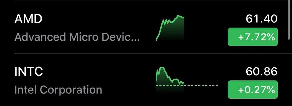 Это случилось. AMD впервые обогнала Intel по цене акций. Люди, которые купили акции AMD за 2 доллара в 2016 году, ликуют. З.Ы. Сейчас небольшой откат: Amd: 59,56 USD Intel 60,43 USD Что сказать - молодцы. Спустя годы проб и ошибок выйти на успех и достойную конкуренцию, а теперь еще и наобгон. Не спорю что капитализация Intel и доход больше чем у AMD, но все таки после публикации отчёта за второй квартал акции компании Intel упали на 8.7% на фоне задержки 7-нм процессоров. Хорошей новостью стал выход 10-нм процессоров Alder Lake во 2 половине 2021 года. Тем временем акции AMD после отчёта Intel выросли на 6%