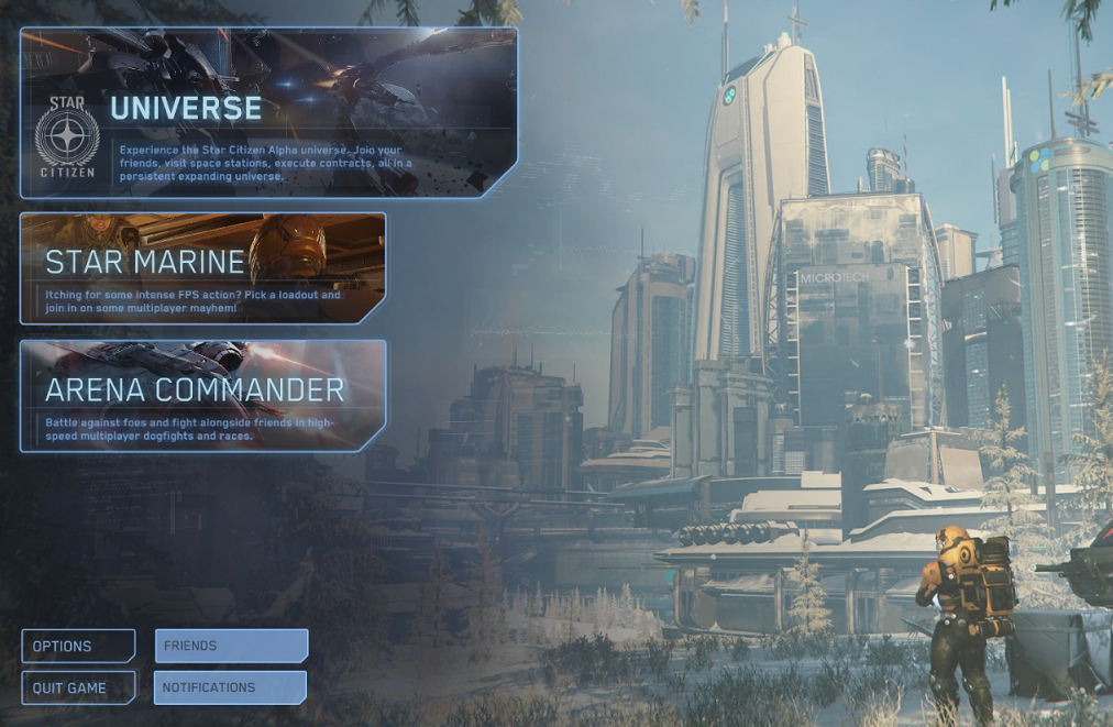 В наше, далеко не спокойное время, когда реальная жизнь сливается с виртуальными мирами, разработчики компьютерных игр все чаще создают удобные условия и платформы для соревнований игроков в своих новых проектах. Игра Star Citizen не исключение. На наших мониторах появляются опции входа в игру. Активны три кнопки слева. Это и есть наша возможность, ПОЯВИТЬСЯ или ПРОЯВИТЬСЯ. Появится в качестве свободного пилота в открытой вселенной "ЮНИВЕРС" или проявить свои качества бойца, пройдя по двум направлениям ниже. Как театр начинается с гардероба, так и кибер спортсмен получает дополнительные опции определится. В качестве тренировок, он может выбрать сессию войны с НПС, но и опция боя с друзьями там тоже присутствует. "АРЕНА КОМАНДЕР", бои в локации с препятствиями с применением игровых кораблей. "СТАР МАРИН", роль пешего бойца с ручным оружием в разных операционных средах. С гравитацией и без. На станциях и снаружи. Ходят слухи, в среде геймерских сообществ, что может появится еще одна