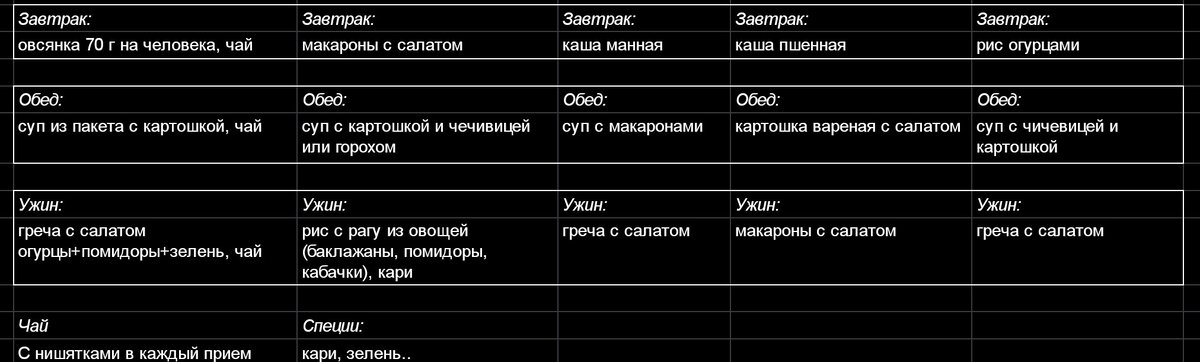 Список (примерный) 1. Овсянка 2. Макароны 3. Каша манная 4. Каша пшенная 5. Рис 6. Картошка 7. Чечевица 8. Супы из пакетов 9. Горох 10. Салаты (огурцы помидоры 🍅 зелень) 11. Греча 12. Баклажаны 🍆 кабачки (рагу) 13. Приправы (кари) 14. Чай 🍵 с ништяками