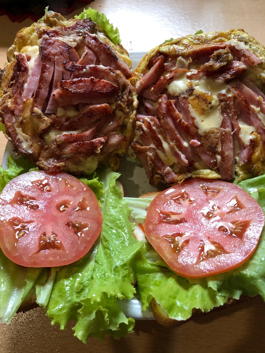 Привет,друзья! Сегодня расскажу обалденный рецепт 👍🏻 Готовится очень быстро,а главное просто. Нам понадобится для одного бутерброда: Помидора 1шм. Листья салата 4 шт. Масло сливочное-в этом весь секрет❤️ Яйцо 1шт Сыр Ветчина Тостовый Хлеб. Первое,что делаем,обжариваем хлеб на сливочном масле с одной стороны,далее взбалтывает яйцо,выливает на сковородку,добавляет ветчину и сыр,ждёт,когда подрумянится первая сторона,переворачивает,доводит до готовности вторую сторону и снимает(Всё обжаривается на сливочном масле). На хлеб наливаем кетчуп (можно использовать любой) ,далее кладёт 2 листика салата,помидорку(нарезана кольцами) и наконец выкладывает саму вкуснятину из яйца,ветчины и сыра,на верх 2 листика салата и второй кусочек хлеба❤️ Всё готово! Приятного аппетита😉