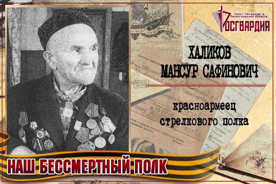 Об участнике Сталинградской битвы, освобождения Украины, Польши, и знаменитой встречи на Эльбе, своём деде Мансуре Сафиновиче Халикове в рамках акции Главного управления Росгвардии по г.Санкт-Петербургу и Ленинградской области «Наш Бессмертный Полк» рассказывает командир отделения группы охраны ГУ Росгвардии прапорщик Артур Халиков.