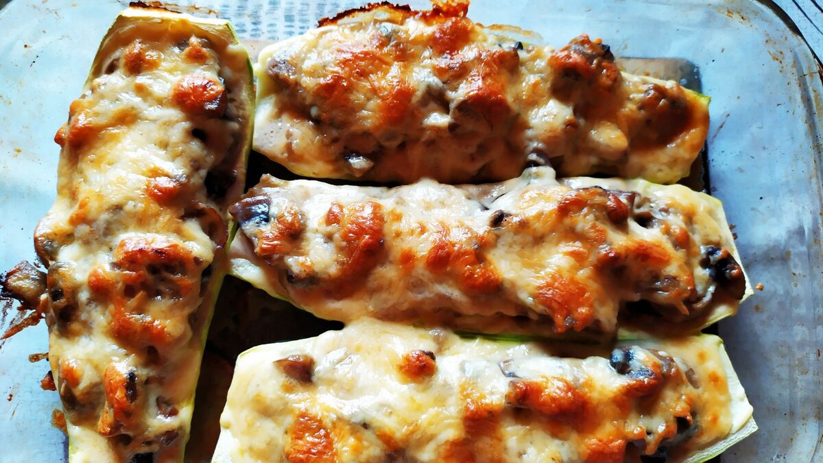 На мой взгляд самая интересная и вкусная подача жульена в молодом кабачке. Вообще мне нравиться когда съедобно не только основное блюдо, но и то в чем это блюдо готовилось... Уверен всем понравится. В целом приготовить жульен в кабачке совсем не сложно. Примерное время от начала и до готовности составит около 1 часа с копейками. Нам потребуются следующие ингредиенты: 1. Грибы шампиньоны 700-800 гр. 2. Лук репчатый 2 головки 3. Молодой кабачок 2 шт 4. Сметана 10-20% около 2 ст. л. 5. Чеснок 1-2 зубчика 5. Сыр, я беру ароматный например Гауда 150 гр. 6. Соль, перец по вкусу, как всегда Для начала моем все овощи, грибы просушиваем в дуршлаге. Лук нарезаем полукольцами. Обжариваем лучек до золотистой корочки. Минут 7-10 на среднем огне. Далее к луку добавляем нарезанные шампиньоны. Не режьте очень мелко, т.к. шампиньоны в процессе ужарки сильно уменьшаются в размере. Иначе мы не будем ощущать грибы при дегустации блюда. После обжарки грибов в течении 10 минут, периодически поме