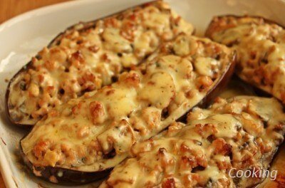 Разрезаем баклажаны пополам, вынимаем мякоть. Немного солим и оставляем на 15 минут. Лук измельчаем и обжариваем. Добавляем грибы и измельченную мякоть баклажанов. Добавляем фарш, солим, перчим. Баклажановые лодочки промываем водой от лишней соли и начиняем фаршем с грибами. Запекаем в духовке 30 минут при температуре ~ 220 С. После этого достаем, посыпаем сыром и запекаем еще 10 минут.