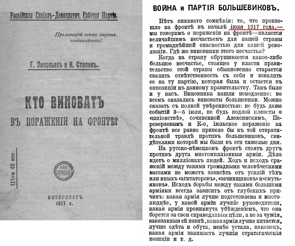 А вот брошюра от 1917 года, в которой товарищ Сталин и товарищ Зиновьев утверждают, что большевики не имеют ровно никакого отношения к провалу наступления русских войск: