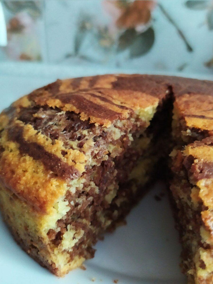 Получается очень нежный и вкусный! Готовится просто и быстро! Для этого нам понадобятся такие ингридиенты: Смешиваем кефир с манной крупой и оставляем на 1 час, чтобы манка набухла. Взбиваем яйца с сахаром, растопленным слив. маслом, и охлаждаем. В набухшую манку с кефиром добавляем взбитые яйца, слив.масло и перемешиваем. В массу добавляем соду (можно погасить уксусом) + ванилин + муку. Всё тщательно перемешиваем. Делим тесто на 2 части. В одну часть добавляем какао. Чередуя слои, делаем рисунок зубочисткой от края к середине. Разогреваем духовку до 190-200 градусов и ставим на 30-40 минут. Приятного аппетита!))